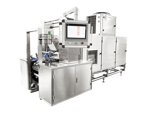 Un tunnel de refroidissement à deux passages est installé après le déposeur avec un système d'éjection sous la tête du déposeur. Pour le refroidissement des bonbons, l'air est aspiré de l'usine et circule dans le tunnel grâce à plusieurs ventilateurs. Les bonbons doivent ensuite être réfrigérés. En sortant du tunnel de refroidissement, les bonbons sont considérés comme des produits finis.